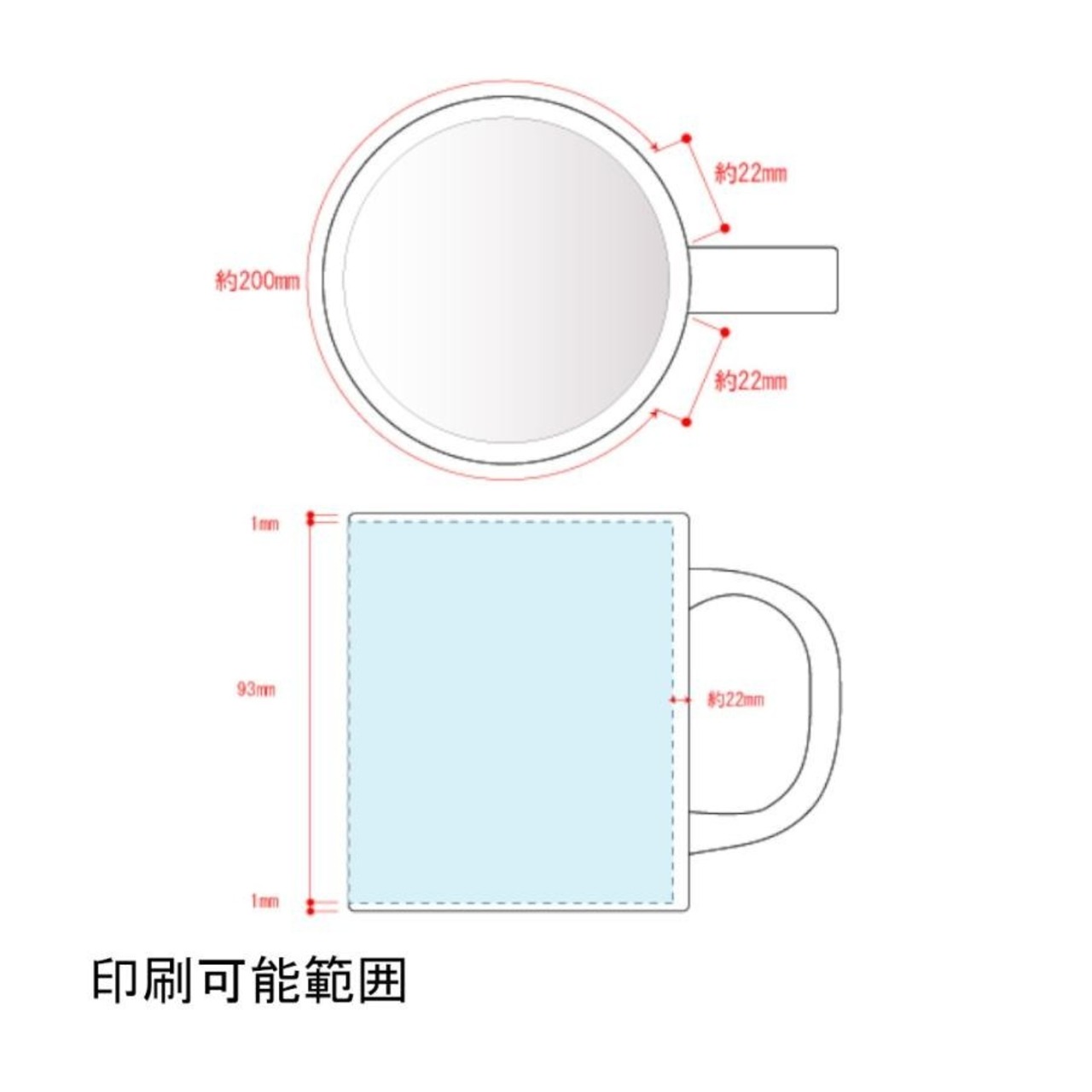 通常のマグカップよりもプリント範囲が大きく、95mmの高さに対して93mmの範囲でプリント可能です。